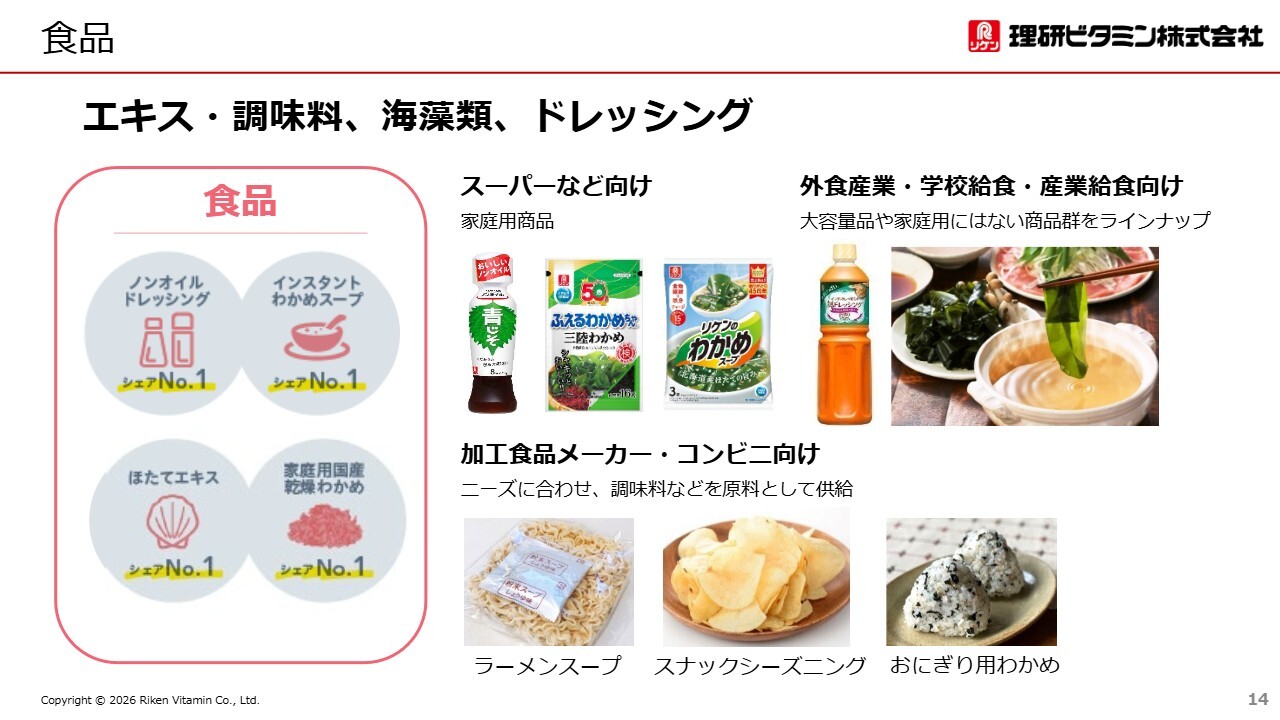 井上:販売製品と製品分野別の売上構成についてです。家庭用食品では、一般のスーパーマーケットで改良剤を見かけることはなく、食品が100パーセントを占めています。業務用食品は、食品の比率が高いものの、さまざまな場面で改良剤も提案しています。加工食品原料等は、改良剤とヘルスケアで大部分を占め、食品はそれほど多くありません。