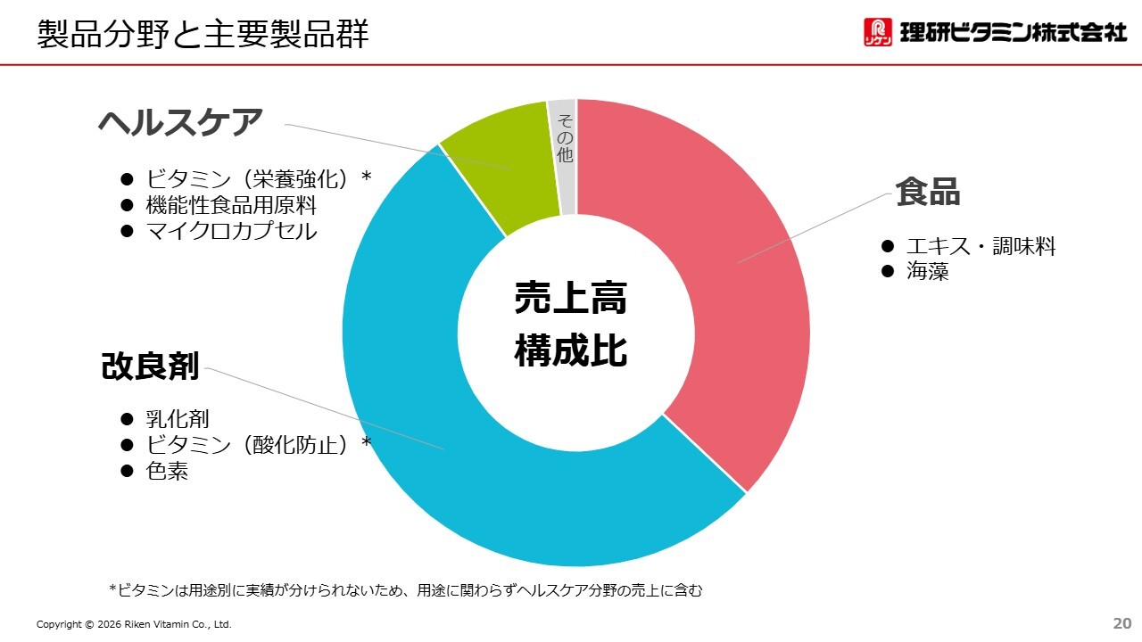 井上:具体的な数字はお伝えできませんが、これらの製品の構成比を円グラフで記載しています。改良剤が半分以上を占め、食品、ヘルスケアが続きます。ヘルスケアは売上構成比こそ低いものの、医薬品の原料などにも利用されており、利益率が比較的高い事業です。