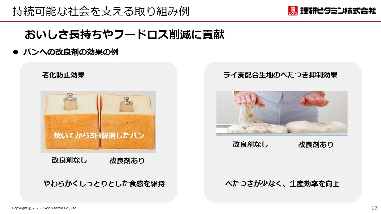 しかし、スライド左側の写真のとおり、焼いてから3日経過したパンを改良剤が入ったものと入っていないもので比較すると、改良剤入りのパンは3日経過後も柔らかさが持続し、形もしっかり保たれていました。このように、改良剤の効果は非常にわかりやすいです。