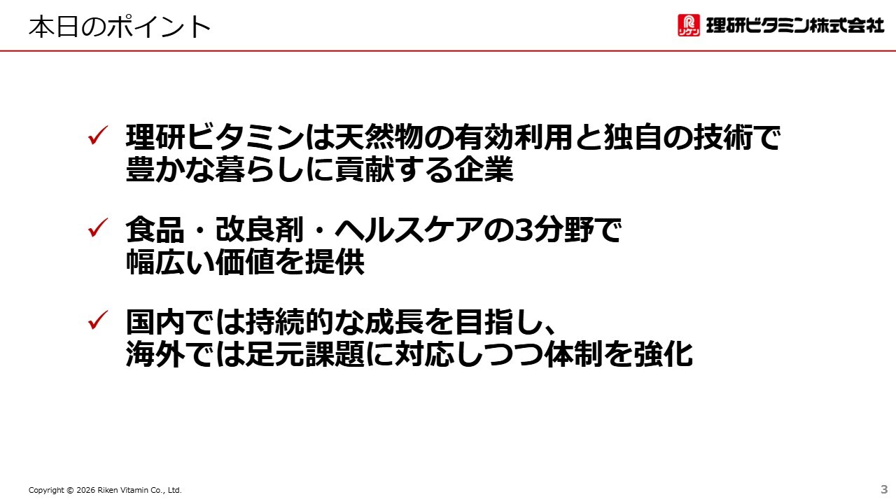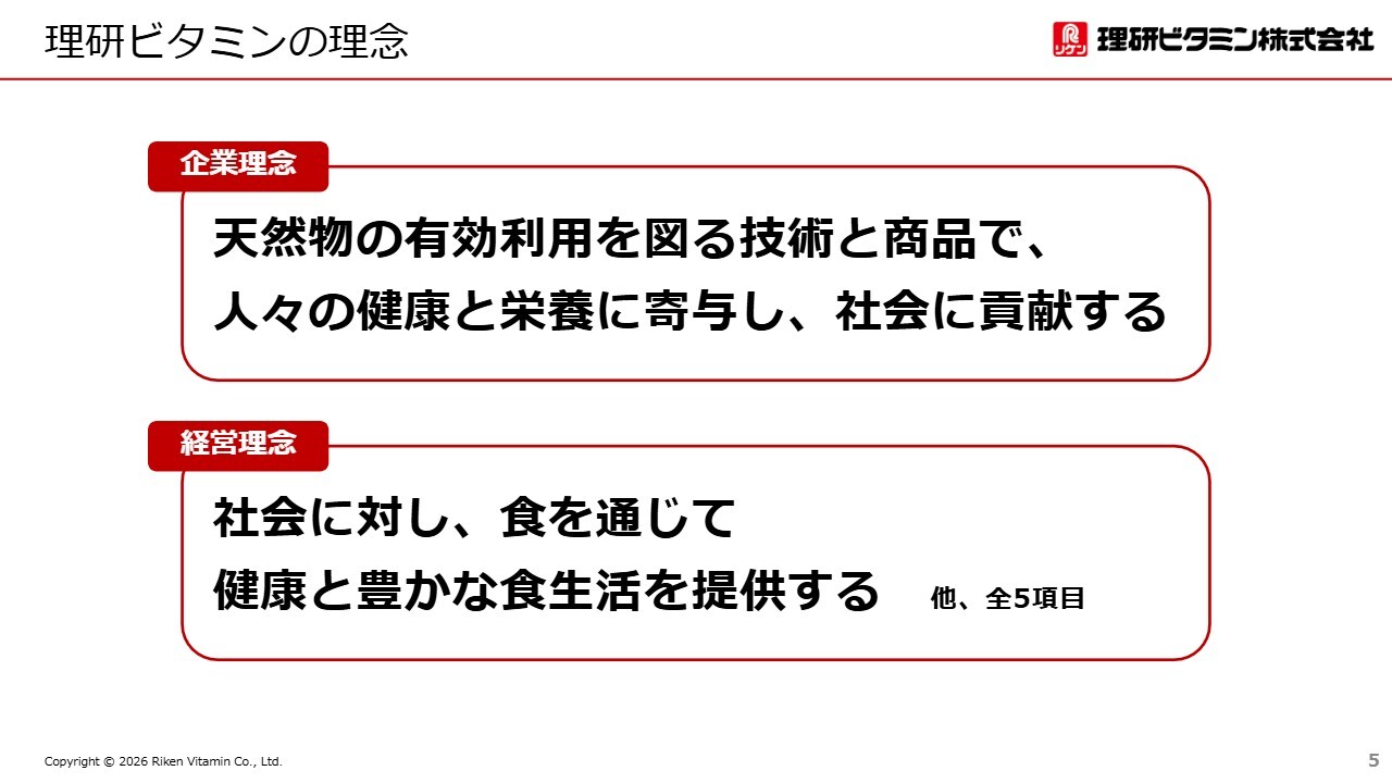 井上与志也氏(以下、井上):みなさま、こんにちは。理研ビタミン株式会社広報IR部長の井上です。本日はご視聴いただき、ありがとうございます。本日の内容はスライドのとおりです。