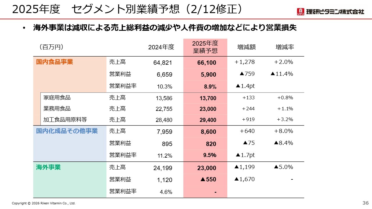 井上:セグメント別の業績予想です。スライド下の海外事業が非常に厳しい状況です。前期は11億円の利益でしたが、今期は5億5,000万円の営業損失となる見込みです。先ほどお話しした原因が大きく影響しているため、対応をしっかりと進めていく考えです。