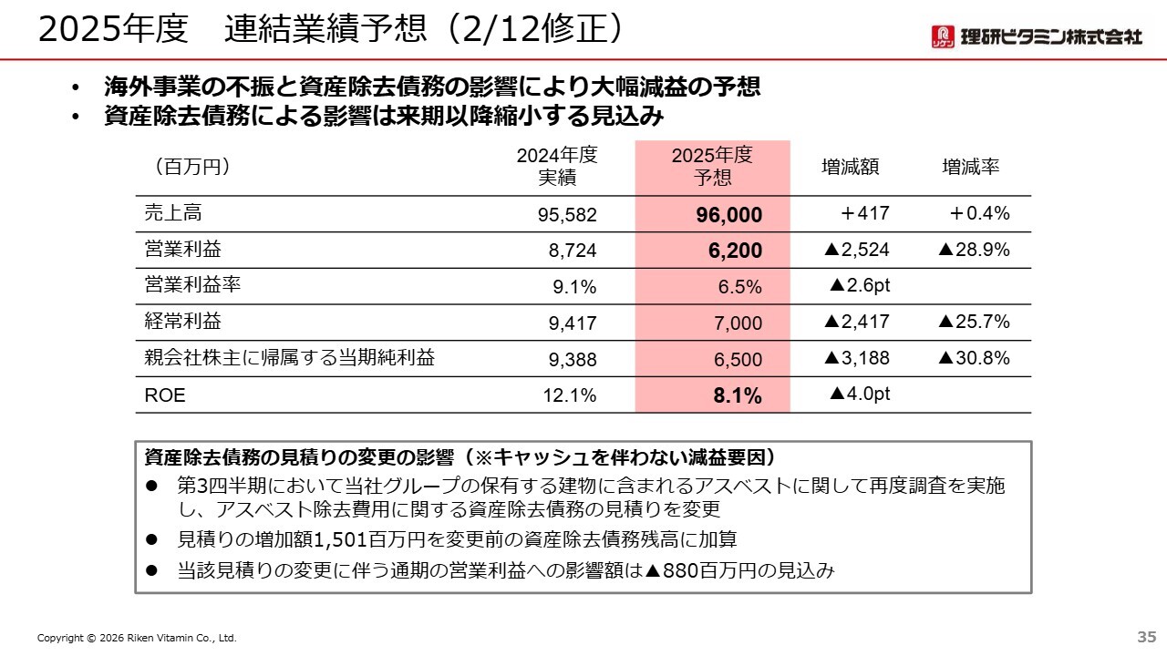 井上:業績についてです。2026年3月期連結業績予想は第3四半期に下方修正しました。要因は2つあります。1つ目は先ほどお話しした海外事業の不振、2つ目は資産除去債務の影響です。