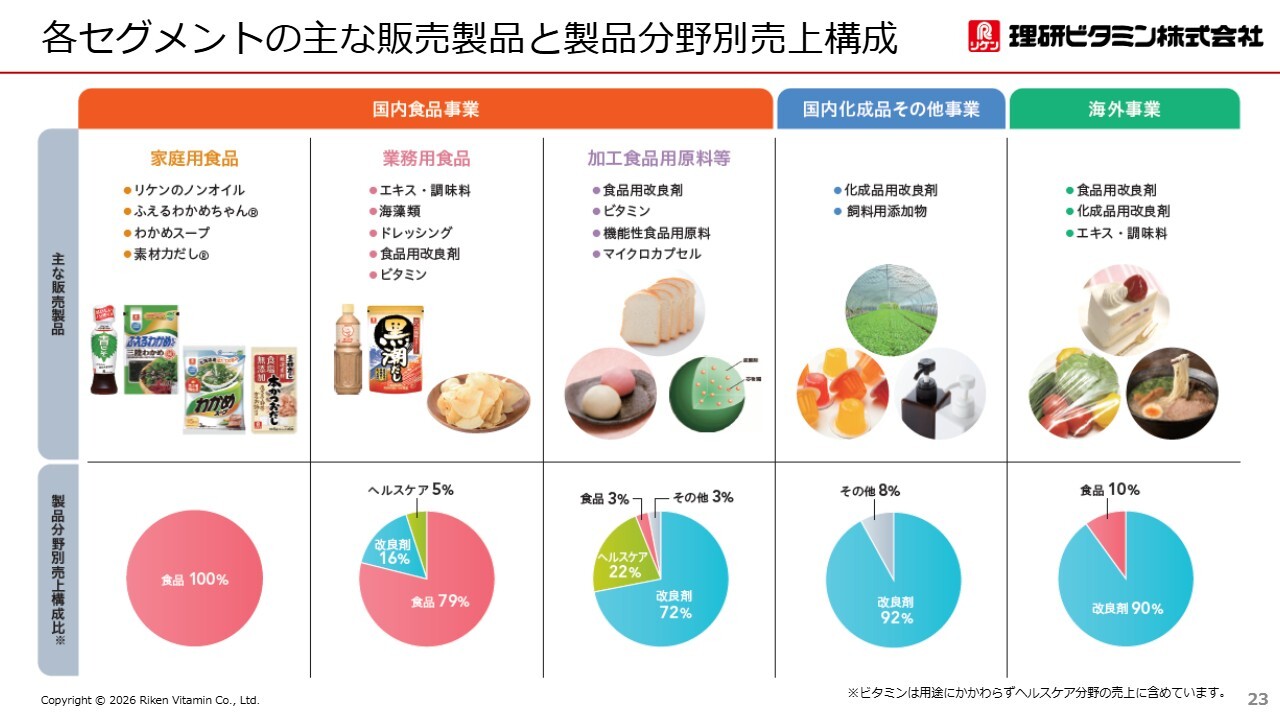 国内化成品その他事業と海外事業は、改良剤が中心となっています。なお、海外事業では一部ポークエキスを扱っており、それが食品の構成比である10パーセントに含まれます。