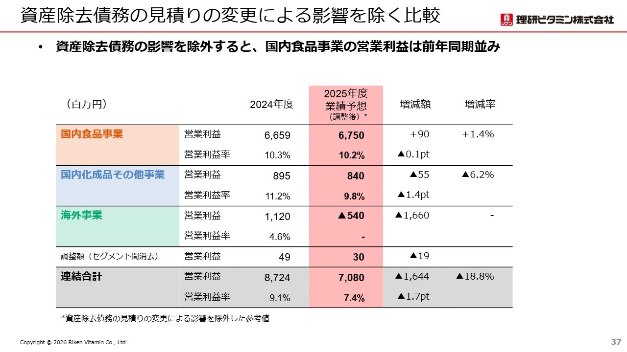 井上:スライドは、資産除去債務の見積もりの変更による影響を除いた比較になります。国内食品事業は、この影響を除いた場合、営業利益が前期比で若干増加しています。一方、今期は海外事業が非常に誤算でした。