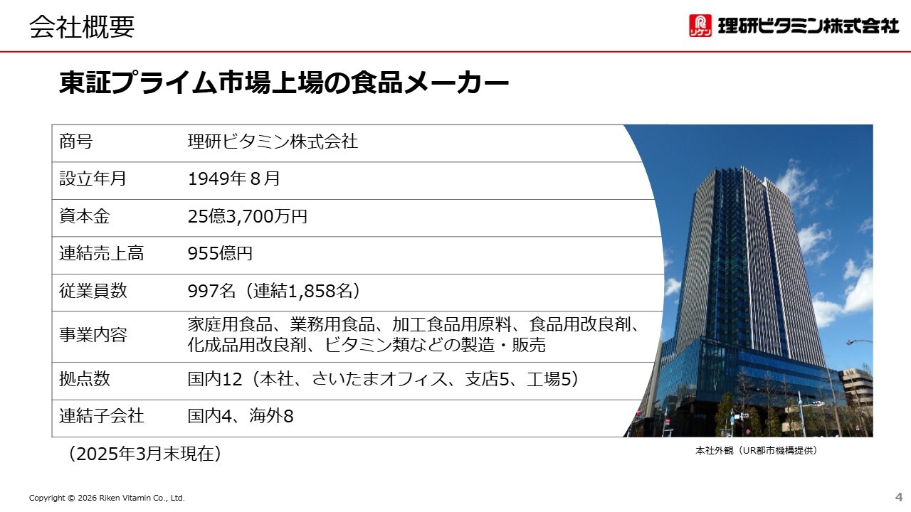 井上:会社概要です。当社は東証プライム市場に上場する食品メーカーです。設立は1949年で、今年で創業77年です。本社は東京にあります。2025年3月期の連結売上高は955億円で、プライム市場の食品セクターでは中堅企業に該当します。