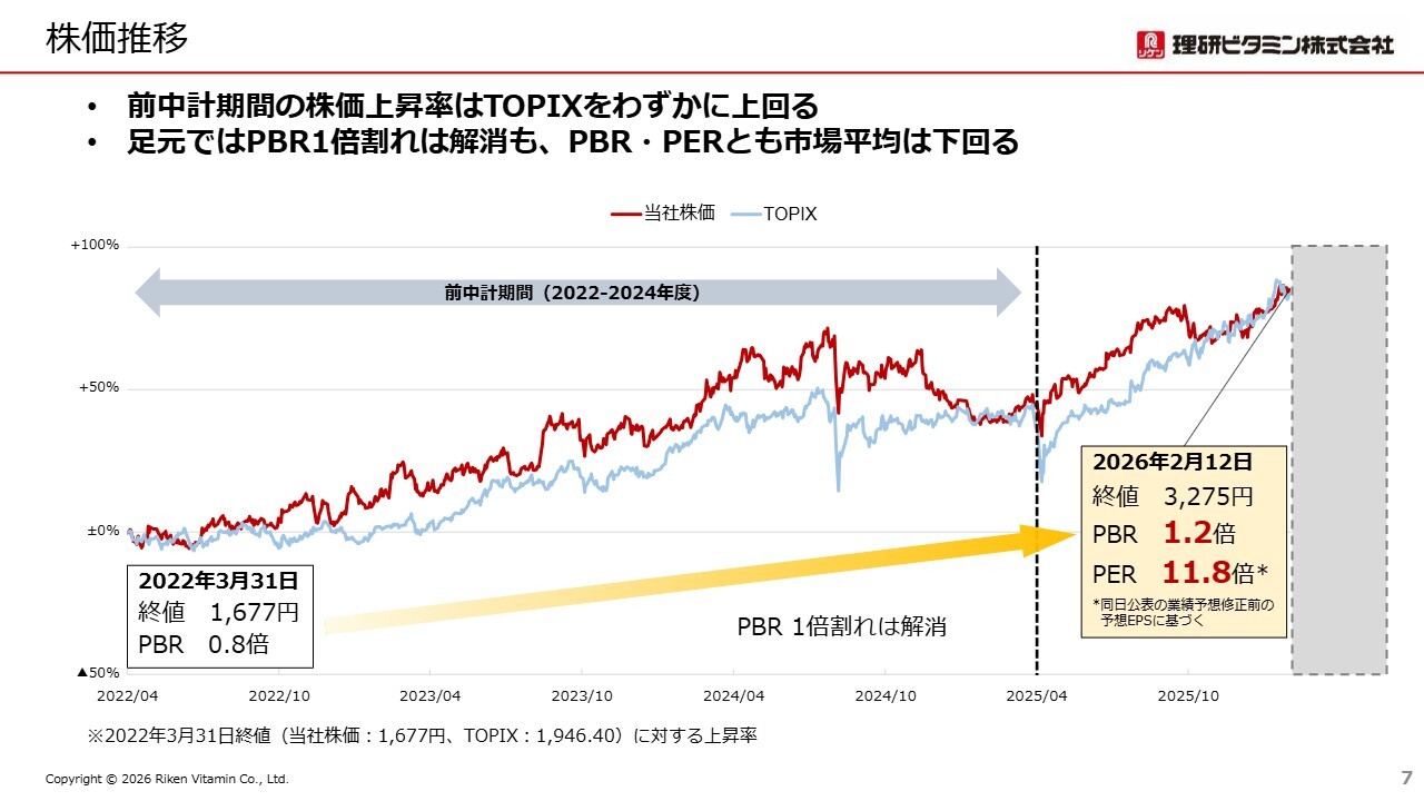 井上:株価についてです。当社の決算発表日である2月12日時点での株価は3,275円でしたが、業績予想を一部変更したことも影響して、2月20日の終値は3,000円となっています。ここ3年間の推移を見ると、株価は着実に上がってきており、TOPIXと同じような動きをしています。