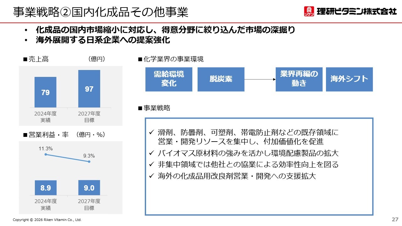 井上:国内化成品その他事業についてです。化成品業界は非常に厳しい状況にあります。海外メーカーによる供給過剰の問題があり、昨今のニュースでも業界再編の動きが見られています。