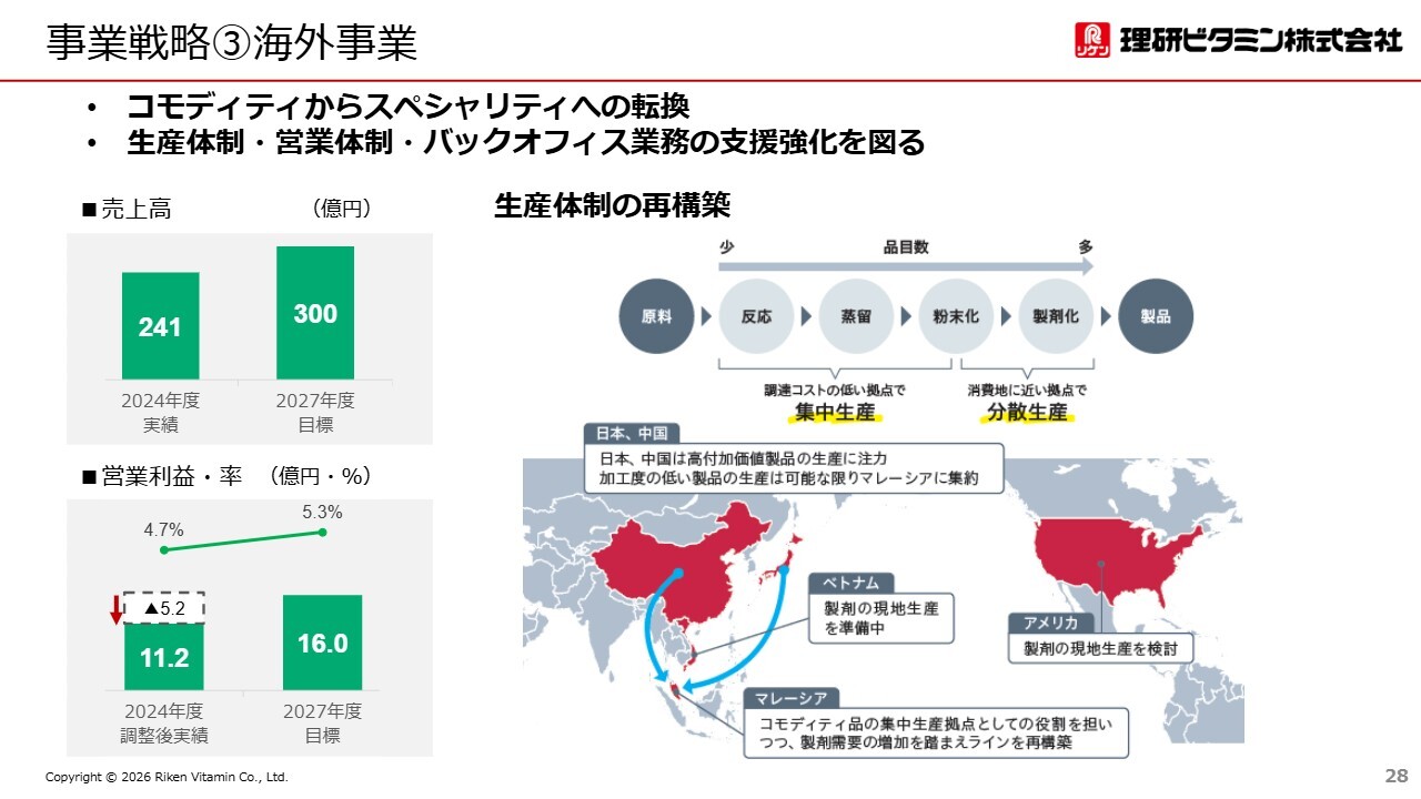 井上:海外事業についてです。海外事業は改良剤を中心としたビジネスです。「中計2027」では、コモディティからスペシャリティへの転換を大きなテーマに掲げています。