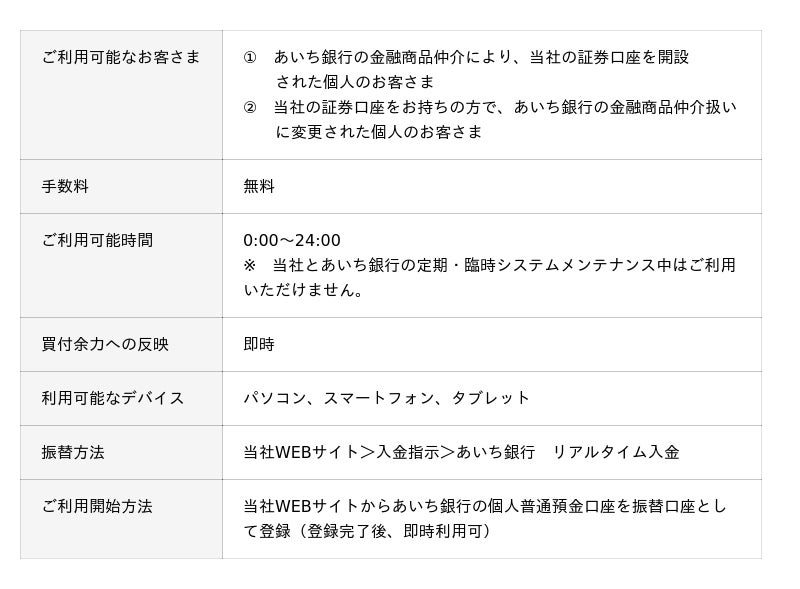 このたびのリアルタイム入金サービスの導入により、あいち銀行をご利用のお客さまは、これまで以上にスムーズなお取引が可能となります。当社は、今後も「顧客中心主義」の経営理念のもと、より良い投資環境を提供できるようサービスの拡充に努めていきます。