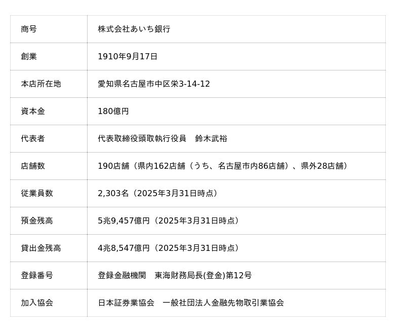 あいち銀行は愛知県名古屋市に本店を置く地域金融機関で、金融サービスを通じて、地域社会の繁栄に貢献し、「愛知県No.1の地域金融グループを目指す」ことを掲げています。