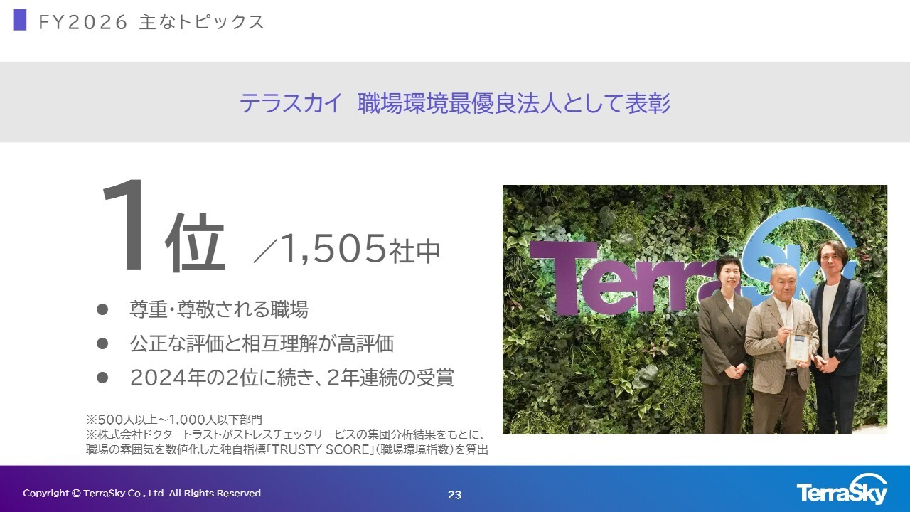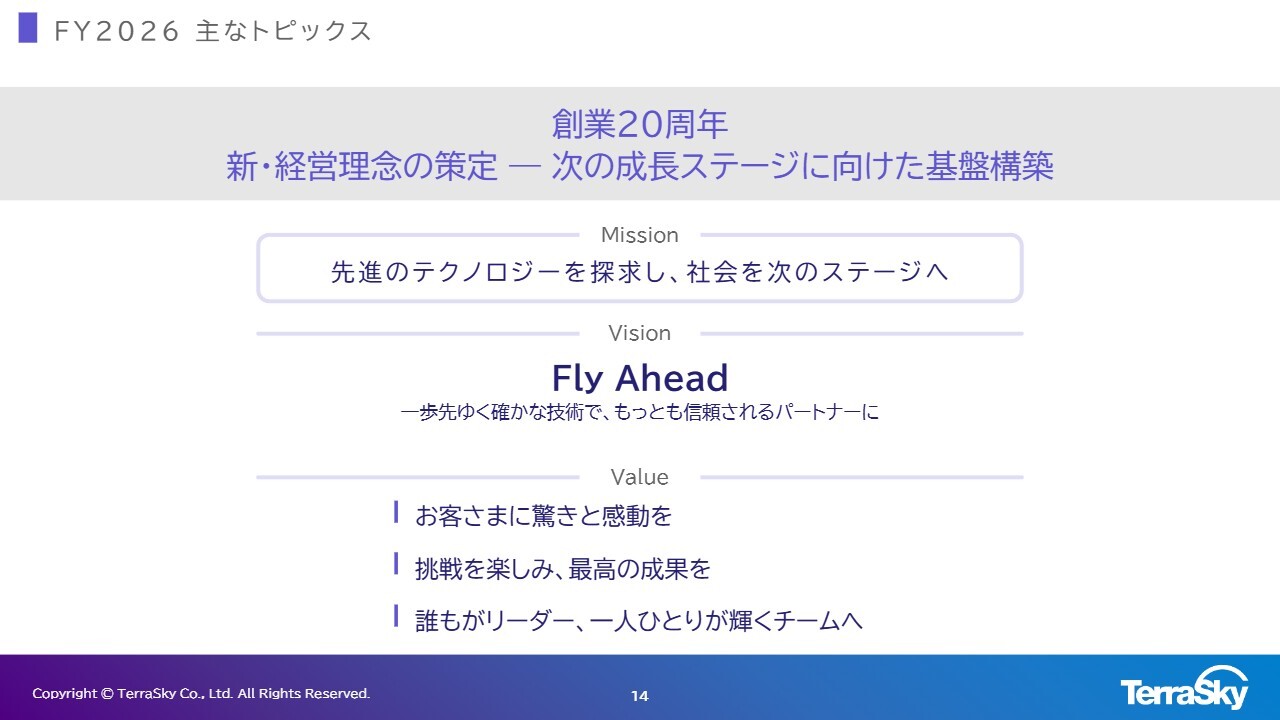 FY2026のトピックスについてご紹介します。当社は創業10年目にあたる2015年の上場時に経営理念を発表しました。今年度は設立20周年を記念して新しい時代に合わせた経営理念を策定、発表しました。