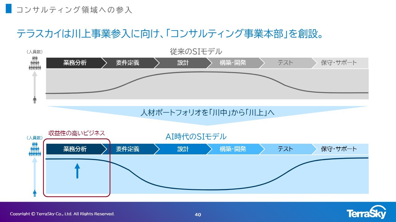 当社はAI時代を踏まえ、コンサルティング事業への参入を計画し、昨年度から実行しています。スライドのチャートは、上部のグラフが従来のSIerモデルを示しています。