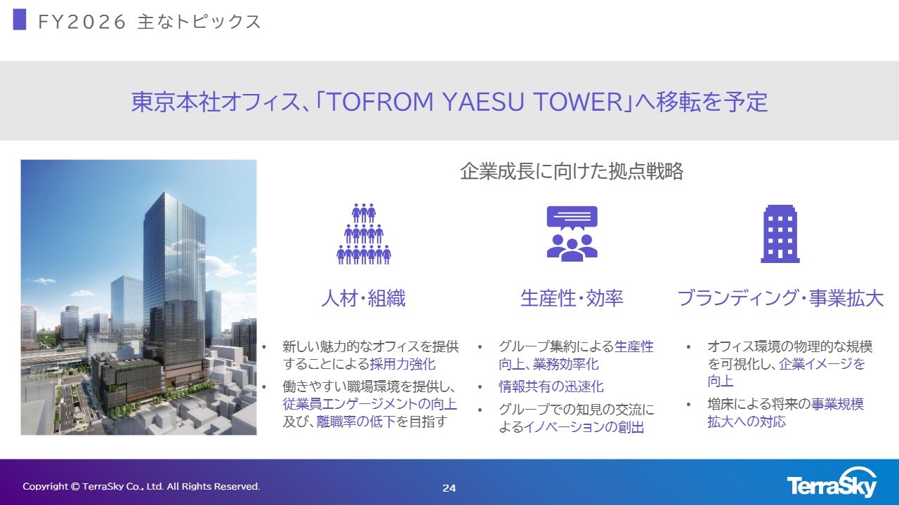 本社移転についてもご報告いたします。本社は現在、東京駅から徒歩7、8分の場所に位置していますが、来年の8月頃を目途に、東京駅地下直結の「TOFROM YAESU TOWER」へ移転する予定です。