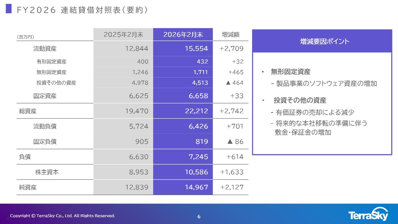 貸借対照表です。昨年度に引き続きソフトウェアへの投資を行っていたため、資産が増えています。また、すでに発表していますが、本社移転計画に伴う費用が計上されています。