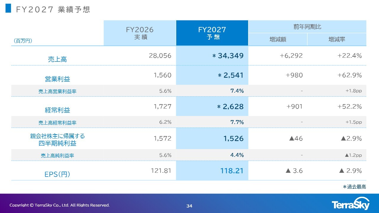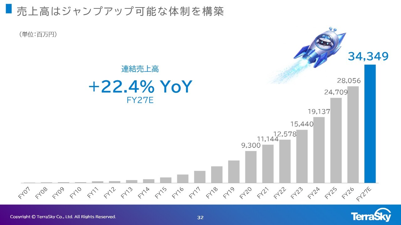 今年度、2027年2月期(FY27)について少しお話しします。今年度の売上目標は、前年比22.4パーセント成長です。昨年度は13パーセント強の成長でしたが、昨年度の取り組みを基盤として、それを上回る力強い成長を目指します。売上目標として343億円を掲げて取り組んでいきたいと思います。