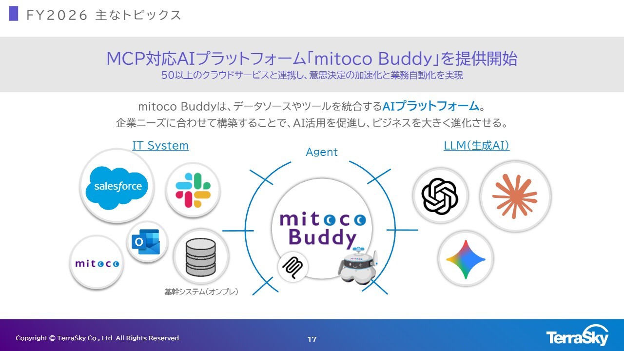 売上に関する3つ目のトピックはAI製品についてです。すでに発表済みの「mitoco Buddy」ですが、今話題のMCPのファンクションをいち早く実装しています。