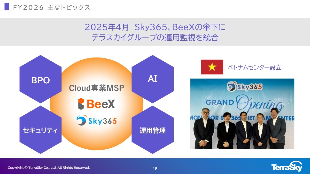 加えて、子会社同士の関係も少しずつ見直しています。MSP事業を展開するSky365という会社は、主に「AWS」や「Azure」といったクラウドのインフラレイヤーをサポートしています。