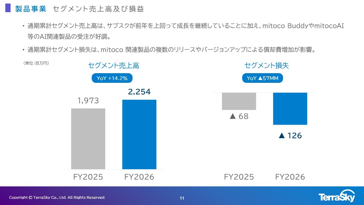 製品事業についてです。先ほどご説明したとおり、売上は前年比14.2パーセント増と、引き続き成長しています。また、新しい製品もリリースしているため、その売上が足元を固めてきていると考えています。