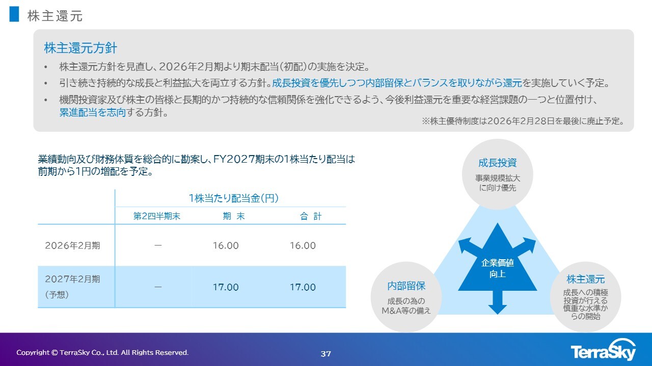 配当についてですが、当社では累進配当を掲げています。今回は少しではありますが増配を行い、17.00円とする計画です。最終的には各機関の承認を得て、このかたちで配当を実施する予定ですが、現時点での計画としては17.00円を予定しています。
