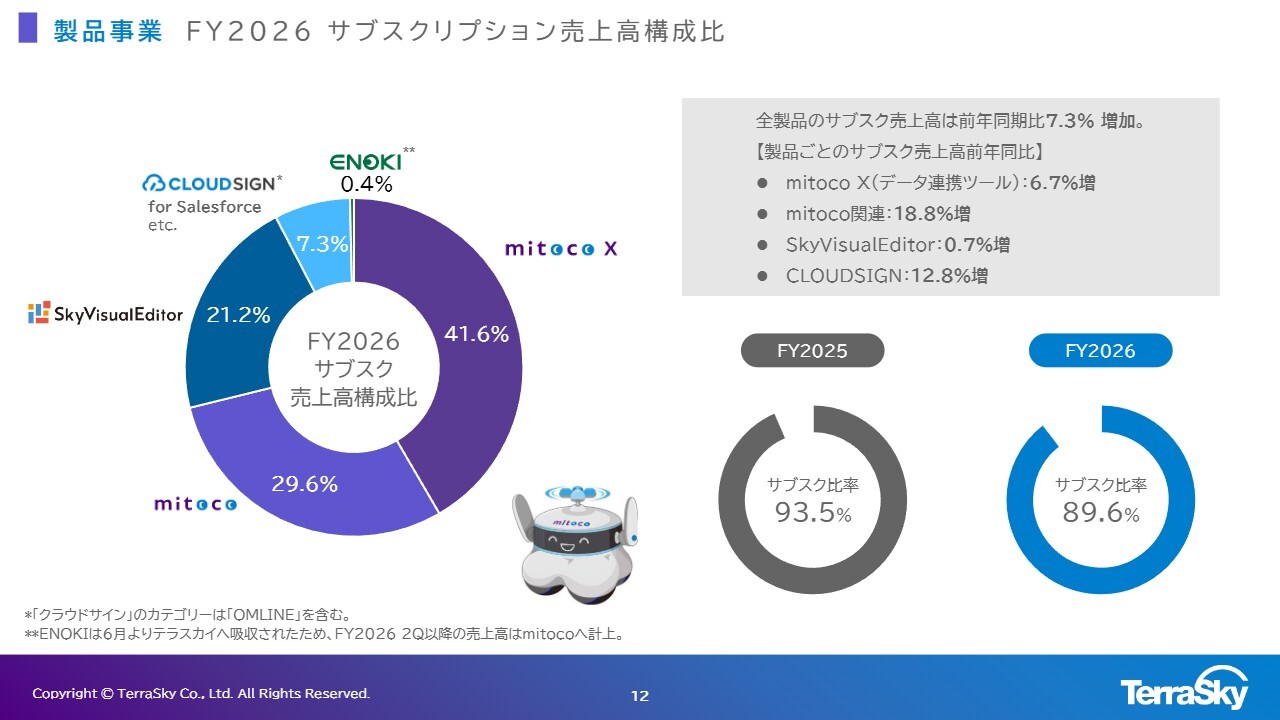 サブスクリプション比率については、初期費用と月額費用を基に算出しています。今年度はサブスクリプションの割合が下がっていますが、これは「mitoco 会計」などのインプリメンテーションに伴う初期サポート費用が計上されているためです。足元では製品の引き合いが強まっており、結果として月額費用だけでなく初期サポート費用もしっかりと上昇し、売上に反映されました。これにより、サブスクリプション比率は89.6パーセントと若干減少しましたが、それだけ製品の導入が加速したことの現れであり、決して悪い兆候ではないとご理解いただければと思います。