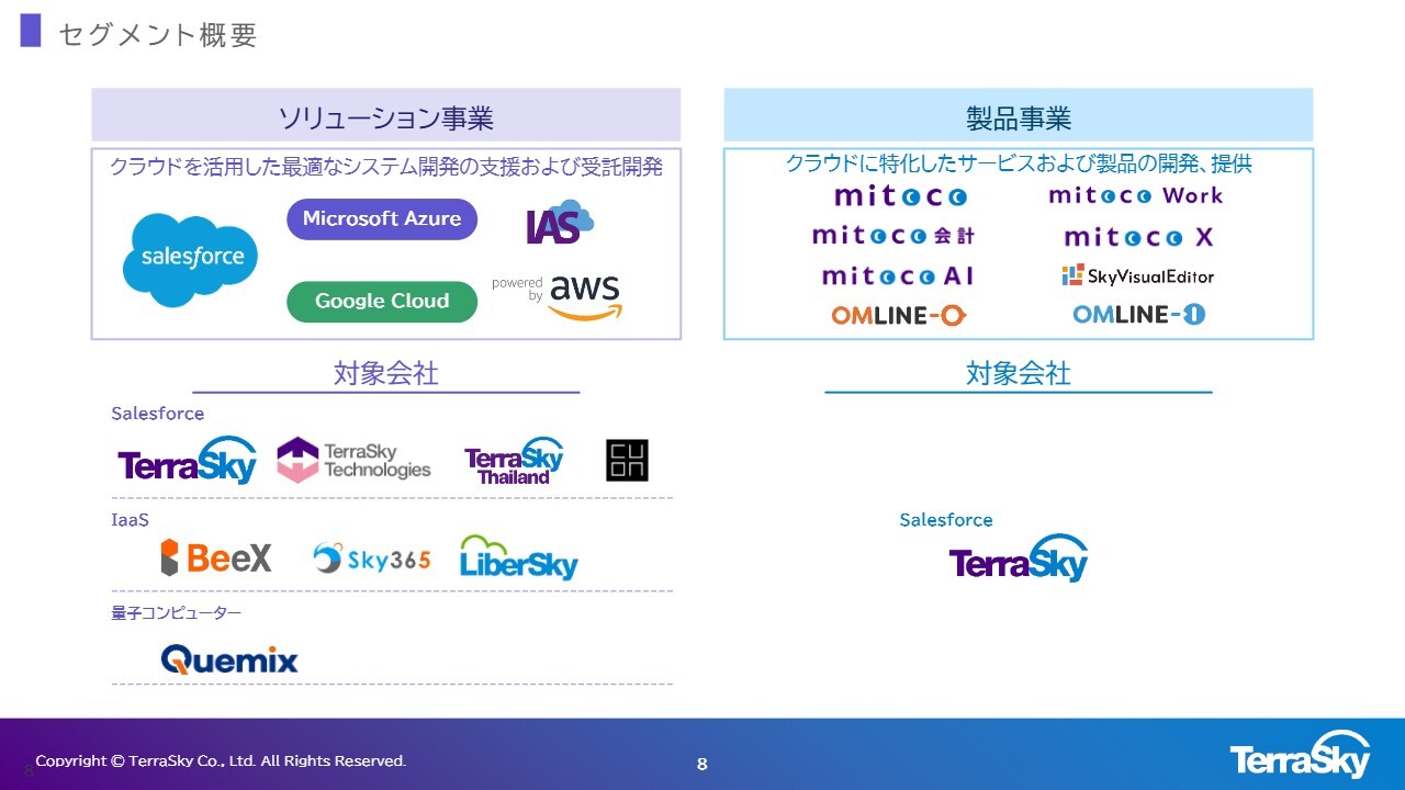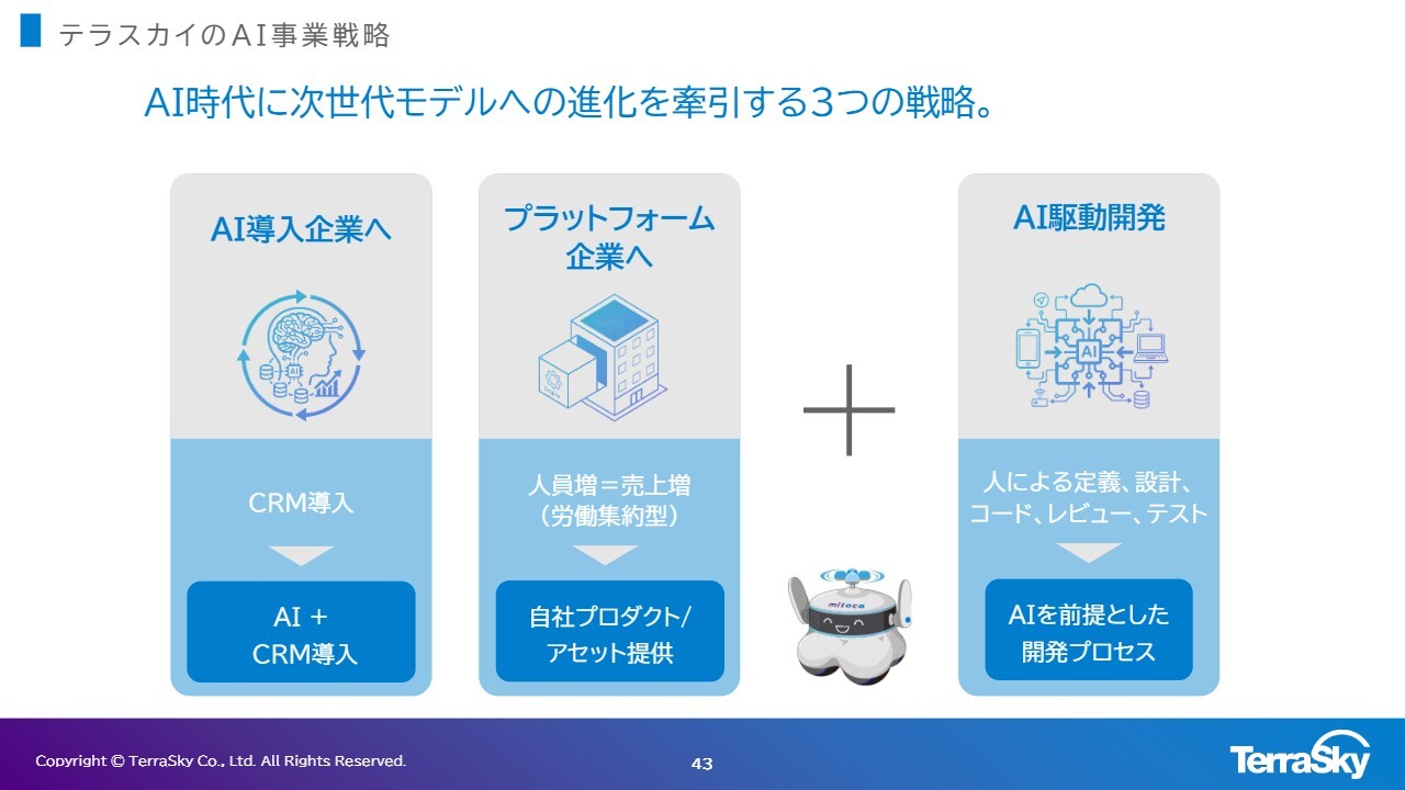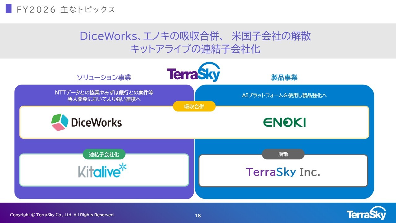 AIを主眼に置いていたエノキという会社についてです。こちらは、独立して運営するよりもテラスカイ単体の社内で事業を推進したほうがより効果が出ると判断し、吸収後ワンチームとして取り組んでいます。