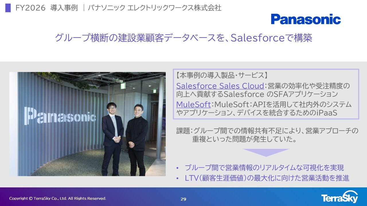 パナソニックさまについてです。エレクトリックワークス社さまは、元の松下電工さまが主体となります。当社はパナソニックエレクトリックワークス社さまを長きにわたりサポートしており、昨年度も引き続きしっかりとサポート実施したことから、このような事例を発表しています。