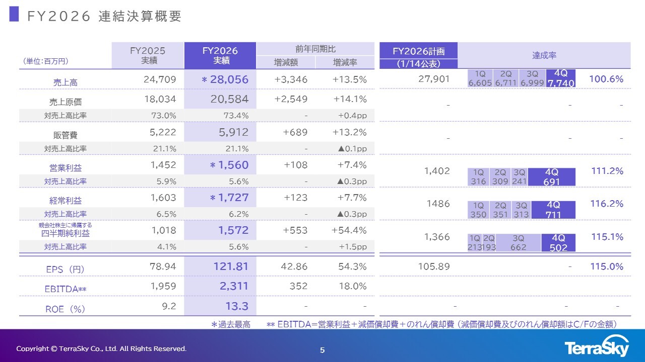 まず、昨年度にあたるFY26の連結決算の概要についてご説明します。おかげさまで売上は2桁成長を継続し、前年比13.5パーセントの成長を達成することができました。