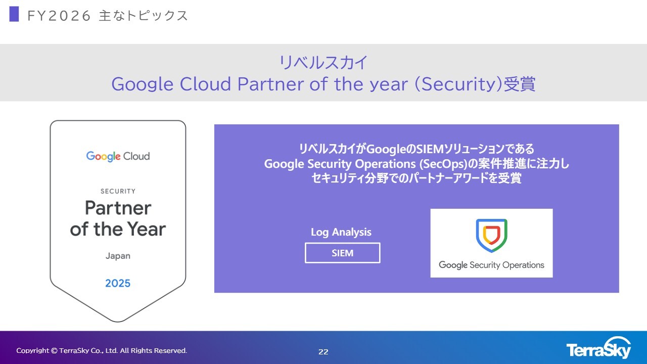 セキュリティ事業を展開しているリベルスカイですが、昨年5月にGoogle Cloudからグローバルで表彰を受けました。これは、Googleが提供しているセキュリティの製品を最も効果的に活用し、販売したことが評価されたものです。