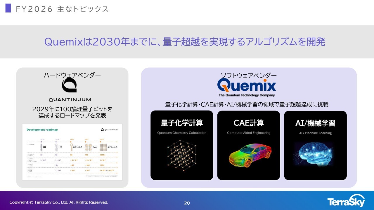 これを活用し、当社のアルゴリズムを進化させてお客さまに提供していきたいと考えています。提供分野については、スライドの右側に記載のとおりで、量子化学計算やCAE、自動車関連のシミュレーション、さらにAI分野があります。