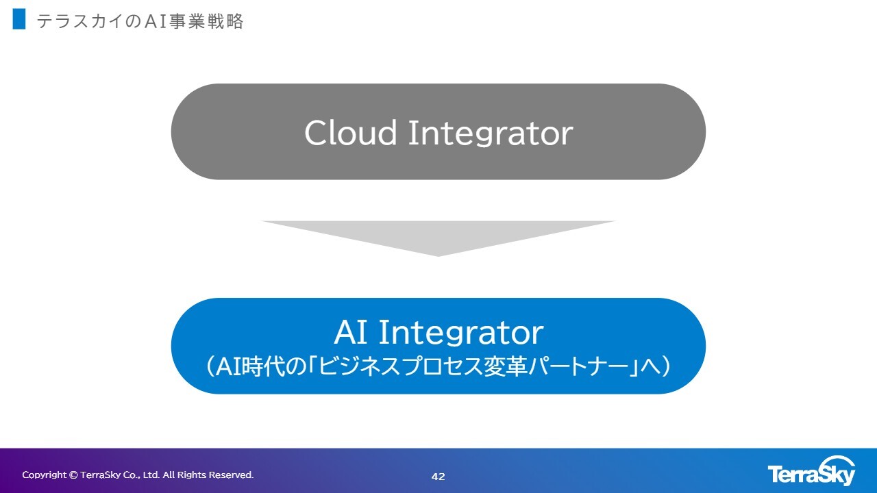 ただ、クラウドがなくなることはありません。現在でも、世の中には汎用機もクライアントサーバー型のシステムも稼働しています。それらもクラウドも引き続き存在し続けますが、当社のビジネスモデルとして、「クラウド・インテグレーター」をメインに据えるのではなく、AIのインテグレーション、「AIインテグレーター」を目指していくことを、年初、社員のみなさまに説明いたしました。