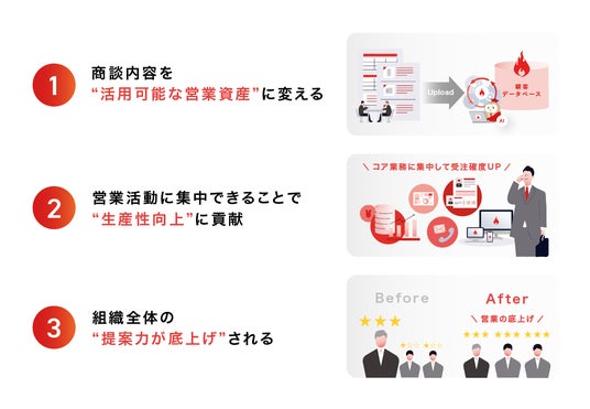 商談内容の記録や共有にかかる工数を大幅に削減することで、提案活動や顧客対応に充てられる時間を確保し、営業の生産性向上を実現します。