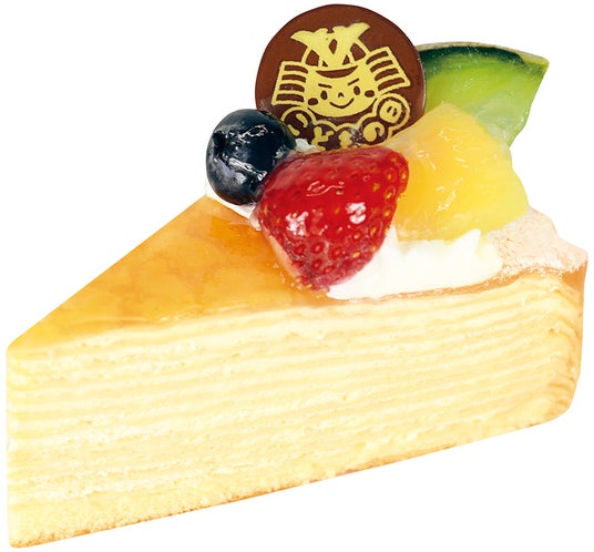 クレープ生地と練乳入り軽いタイプのカスタードクリームを交互に重ね、上部には苺、メロン、ブルーベリー、パイナップルのシロップ漬けを飾りました。こどもの日である5月5日(月・祝)限定で「こどもの日」のチョコアタッチメントが付きます。