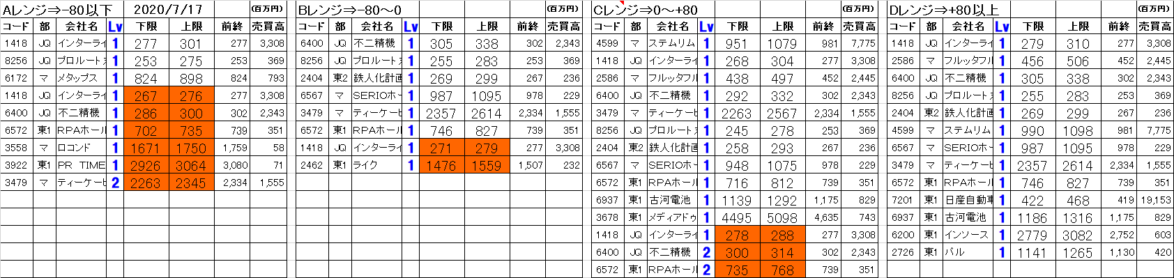 2020/7/17(金曜日) 今日のシステムトレードの仕掛候補一覧です。今日の日経の寄り付きはCレンジでした仕掛表の各レンジは日経平均の前日終値比で以下のよ... ...続きを読む