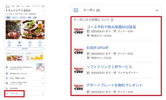 これにより、ユーザーはGoogle 検索で飲食店を調べた際に、検索結果の店舗情報欄で該当店舗で利用できるお得なクーポン情報を確認できるようになります。飲食店が、ネット予約や会計時に利用できるクーポンを楽天ぐるなび上で提供している場合、その情報がGoogle ビジネス プロフィール上に表示されます。