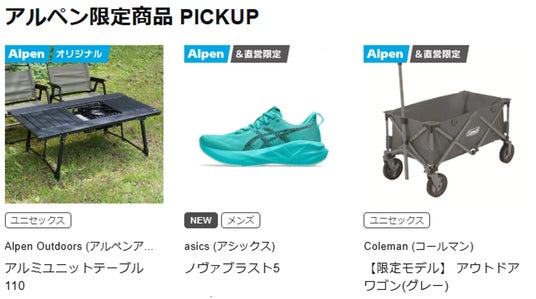 圧倒的な品揃えの中でも、特に存在感を放つのがアルペンとメーカー直営店でしか買えないような限定商品の数々。ナイキ、ニューバランス、アディダス、アシックス、コールマンなど、様々なブランドからアルペンでしか買えない魅力的な商品がいくつもラインナップされています。商品の画像に限定商品である事が一目でわかるアイコンを表示し、多くの商品が並んで見える中でもわかりやすくなっています。アルペンにしかないカラー、アルペンにしかないシリーズなど、今後も続々と発売されていきますのでご期待ください。
