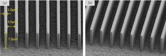 LDI露光により形成した7µm厚TAシリーズの微細パターン(a) レジストパターン(ライン幅/スペース幅=1.0/3.0µm)正面(b) レジストパターン(ライン幅/スペース幅=1.0/3.0µm)斜め