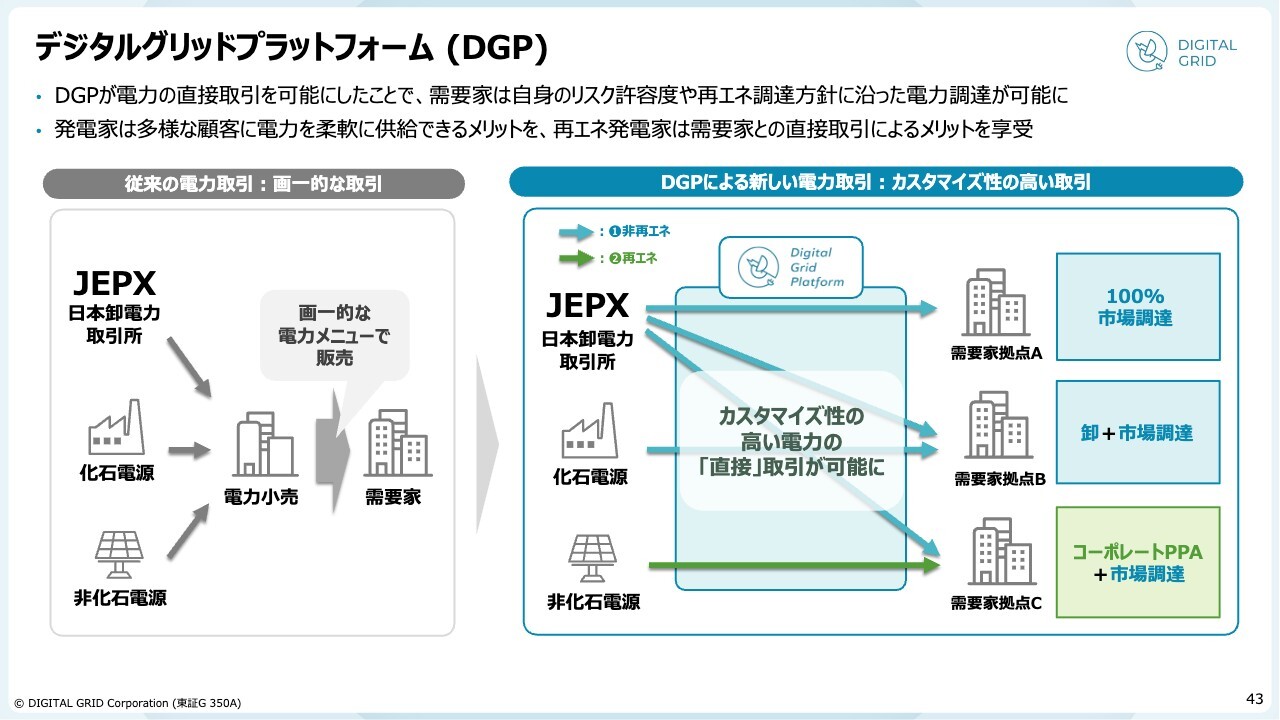 我々は「デジタルグリッドプラットフォーム(DGP)」において、旧来型の電力小売業者から電力を購入するのではなく、卸の市場で取引できるようにする場を提供しています。