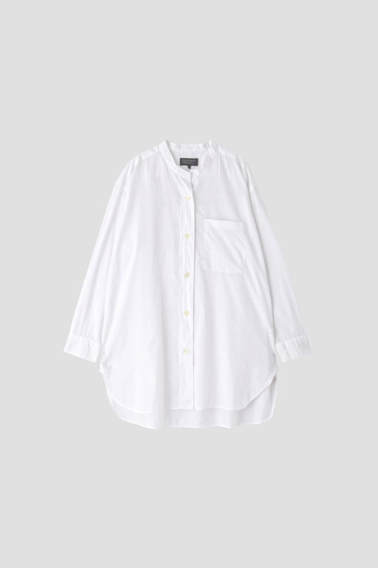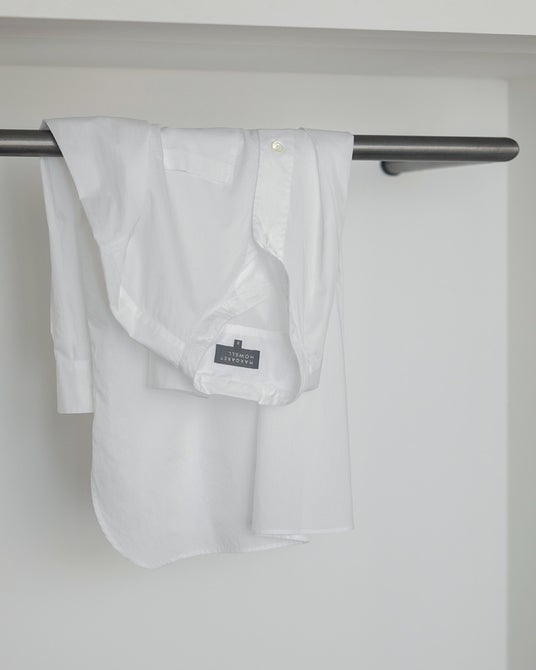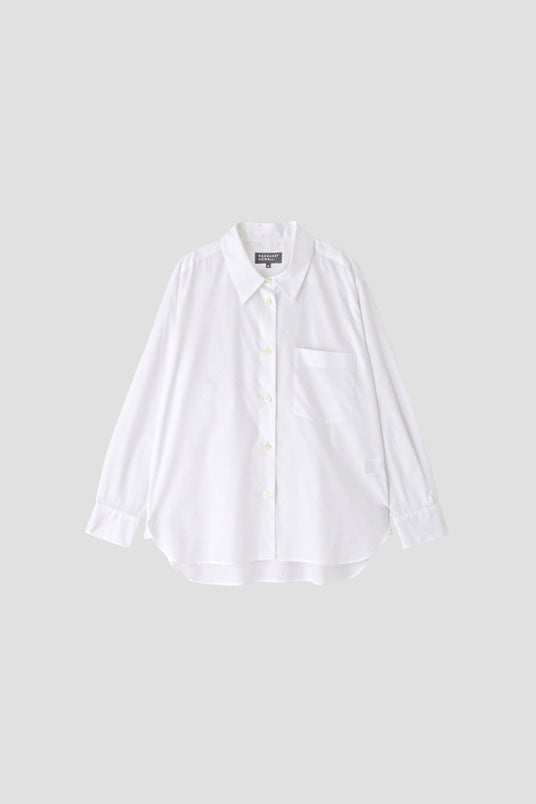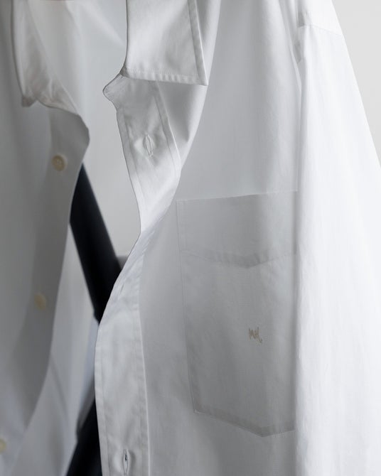 マーガレット・ハウエルのシャツは、素材感やパターン、細かなパーツ使いやディテールなど様々な要素をシーズンごとに緻密に計算して作られています。ウィメンズの限定シャツは、ブランド定番素材であるスイスコットンで作れたシンプルシャツとロングカラーレスシャツ。フラットで繊細な生地感と上質なコットンが持つ控えめな美しい光沢感が特徴です。メンズの限定シャツは、同じくしなやかで光沢のあるスイスコットンを使用したレギュラーカラーシャツで、胸ポケットにマーガレット・ハウエル手書きのイニシャルがベースとなったデザインが刺繍されている特別な一枚です。