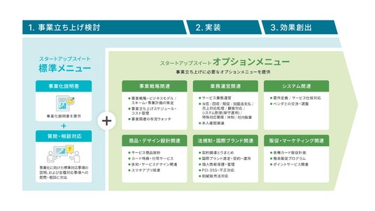 今回提供を開始するスタートアップスイートは、クレジットカード事業を新たに開始しようとするすべての企業に対し、事業の立ち上げから展開まで包括的に支援するパッケージです。事業化に向けたコンサルティングサービスのほか、事業戦略・マーケティング、法規制対応、クレジット業務関連、顧客対応等、クレジットカード事業の立ち上げから展開までに必要なメニューを包括的に提供します。一部のメニューは専門スキルをもつ事業者とのアライアンスのもと、必要に応じて提供します。