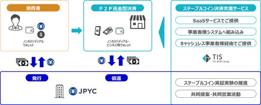 今後は、TISが提供する「ステーブルコイン決済支援サービス」でJPYCが発行・償還する日本円建ステーブルコイン「JPYC」を取り扱うことで、サービス利用事業者は自ら決済システムを構築することなく、国内外の消費者に対しより利便性の高い決済手段を低コストかつ短期間で提供できるようになります。2026年春から夏にかけて実施するPoCでサービスの有用性を検証後、2026年内に「ステーブルコイン決済支援サービス」の正式提供開始を目指します。
