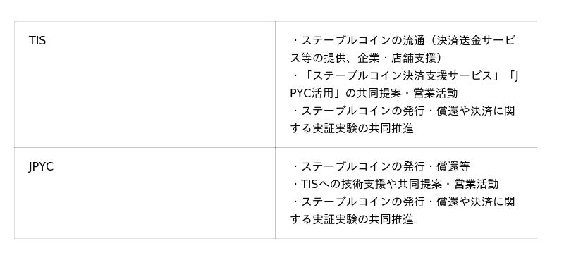 TISのweb3領域やブロックチェーン技術における開発・営業力や、JPYCが持つステーブルコインの発行・償還におけるノウハウを活かし、ステーブルコイン決済の普及に向けた新サービス開発の検討、顧客開拓や関連する新規ビジネスの創出を図ります。ステーブルコイン決済の導入を検討する企業に対し、ステーブルコインの発行・償還・流通のための導入支援やシステムサービスを提供することで、国内でのステーブルコイン決済の普及に取り組みます。ステーブルコインの取り扱いを検討する企業の既存システムへの組み込み、キャッシュレス事業者経由でのシステムサービス提供によるステーブルコイン決済の利用、キャッシュレスを導入されていない中小企業・店舗等によるステーブルコイン決済の取り扱いのためのSaaSサービスの提供など、さまざまな対応を検討しています。今回の協業におけるTISとJPYCの主な役割は以下の通りです。