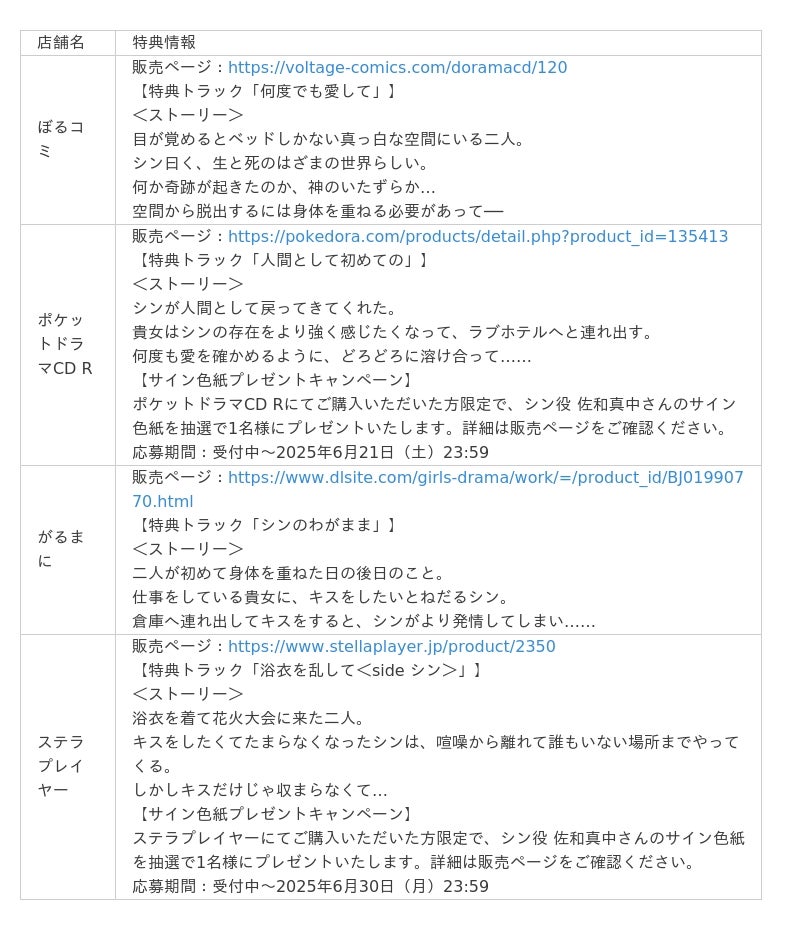 店舗ごとに購入特典をご用意しているほか、ポケットドラマCD Rとステラプレイヤーにてご購入の方を対象に、佐和真中さんのサイン色紙が抽選で1名様に当たるプレゼントキャンペーンも開催中です。