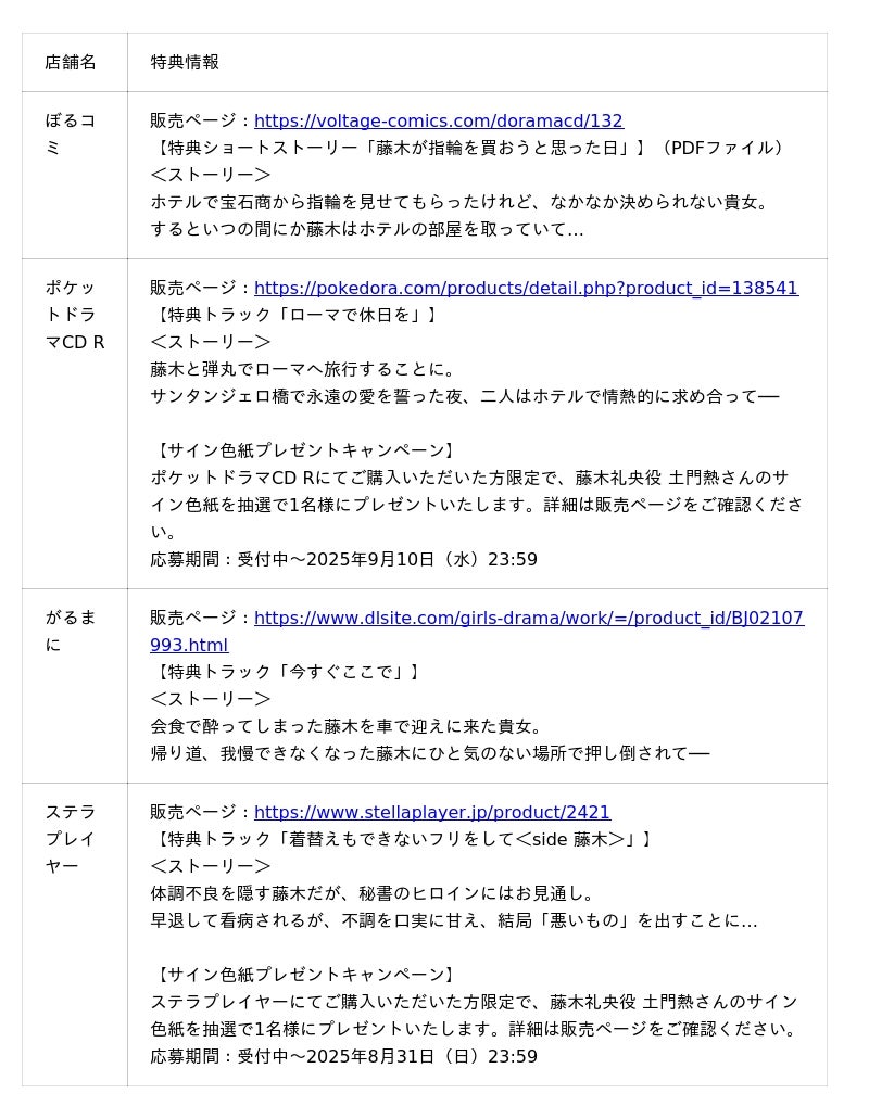 店舗ごとに購入特典をご用意しているほか、ポケットドラマCD Rとステラプレイヤーにてご購入の方を対象に、土門熱さんのサイン色紙が抽選で1名様に当たるプレゼントキャンペーンのほか、各店舗にて「深夜残業」シリーズのセールも開催中です。