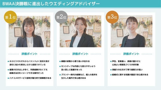 『BEST WEDDING ADVISER AWARD』とは、『ハナユメ』のミッションである「一組でも多くのカップルに“理想の結婚式”のきっかけを」を実現するために、ハナユメウエディングアドバイザーの接客応対スキルの向上を目的としたコンテストです。2015年にキャリアアップ審査会としてスタートし、2018年の開催からは、名称を『BEST WEDDING ADVISER AWARD(以下、BWAA)』に改めました。