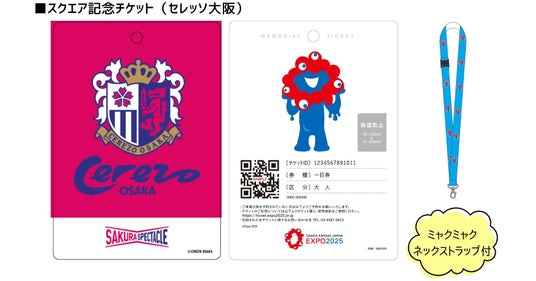 今回、プロスポーツチームとのコラボレーションで発売する記念チケットは、大阪・関西万博の公式マスコット「ミャクミャク」が裏面にデザインされたPET素材のカード型で、表面には各チームのエンブレムがそれぞれレイアウトされた特別デザインです。チケットは付属のストラップで首からかけられる仕様となっており、来場の記念として手元に残すことができるほか、裏面に印字されたQRコードを使用することで、スマートフォンの電波状況やバッテリー残量を気にすることなくスムーズな入場が可能です。また、本記念チケットは水に強い素材を採用しており、急な雨や汗ばむ陽気の中でも読み取りに支障なくお使いいただけます。