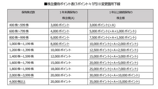 繰越条件:翌年3月末日において株主名簿に同一株主番号で連続2回以上記載された場合にのみ繰越可能です(1回のみ)。3月末日の権利確定日までに株主番号が変更された場合、ポイントは失効します。売却やご本人様以外への名義変更及び相続等により株主番号が変更された場合、当該株主優待ポイントは失効となり、繰越はできませんので十分にご留意ください。