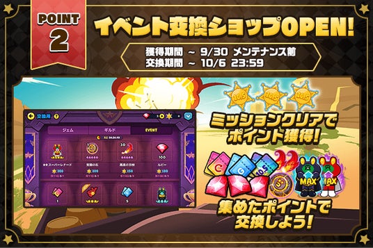 新コンテンツ「イベント交換ショップ」がオープン。各ミッションやログインボーナスで入手できる「イベント交換ポイント」を専用の交換ショップで豪華アイテムと交換することができます。