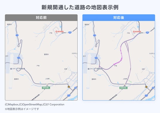 今後は高速道路、一部の道路にくわえて主要路線などにおいても、新規開通道路が即日地図面に表示されます(※3)。今回の即日対応により、ユーザーは、開通したばかりの道路を地図上ですぐに確認でき、最新の情報でルート検索できるため、移動時間の短縮につながります(※4)。また、開通した区間は、開通からしばらくの間、地図の道路上に開通日や路線名が掲載されます(※5)。
