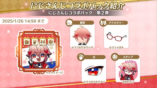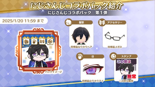 内 容:第1弾では四季凪アキラになりきれる髪型や目パーツ、アクセサリーやオリジナルスタンプなどが入っている期間限定パックが登場!
