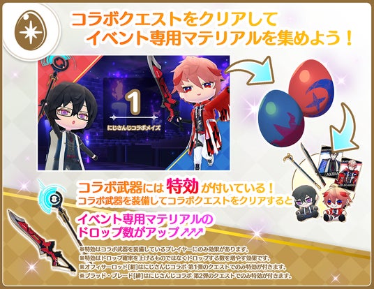 また、コラボコーデガチャから入手できるコラボ武器には『特効』(イベント専用の特殊効果)があり、コラボ武器を装備してコラボクエストをクリアすると、イベント専用マテリアルのドロップ数がアップ!